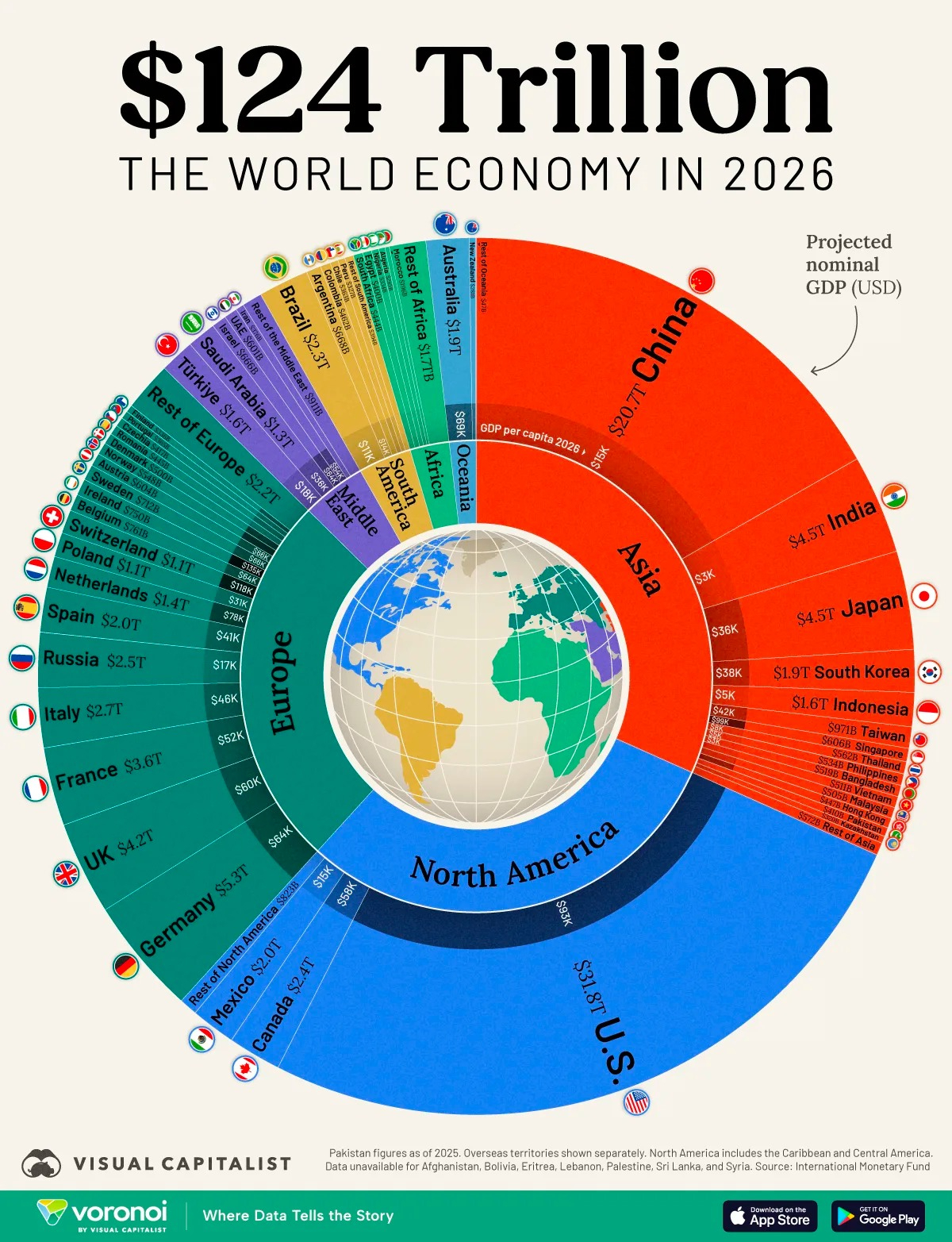 Расстановка лидеров остаётся прежней: США - с прогнозируемым ВВП в $31,8 трлн (по-прежнему крупнейшая экономика мира), Китай - $20,7 трлн, Германия - $5,3 трлн, Индия - $4,5 трлн (удерживает место, обогнав Японию ещё в 2025 году).